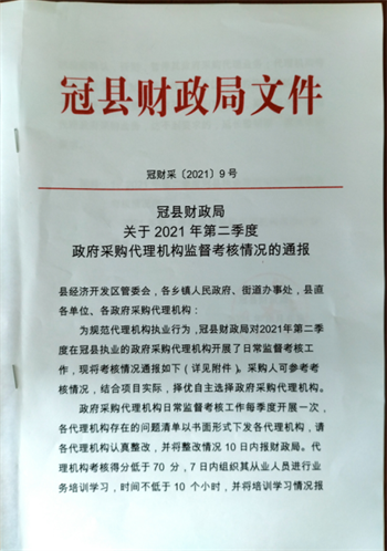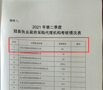為規范招標代理機構執業行為,冠縣財政局對2021年第二季度在冠縣執業的政府采購代理機構進行日常監督考核工作,在嚴格規范的考核下,山東正信招標有限責任公司排名第一,進一步展示了專業技術能力和綜合實力。