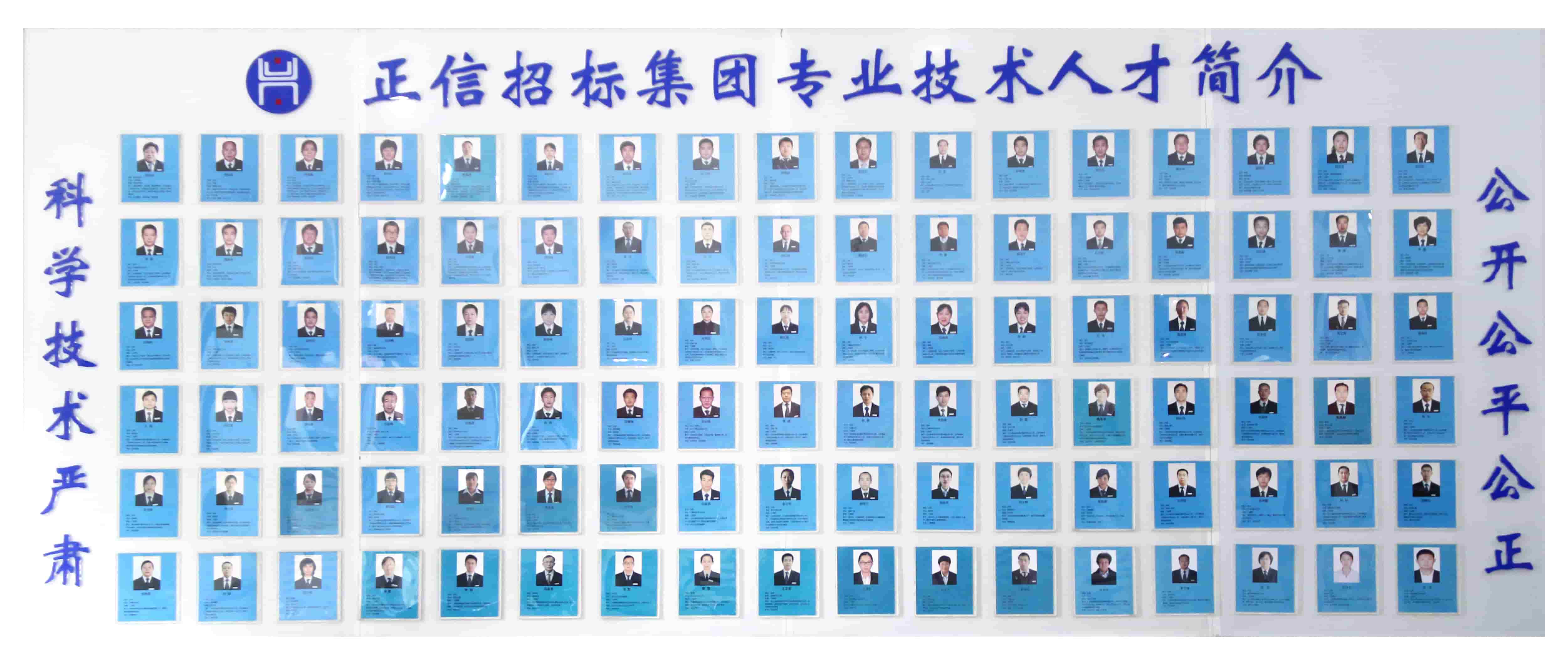 集團現有員工627余人,90%具有大學本科以上學歷,70%以上具有中、高級技術職稱,擁有各類注冊專業技術人才300人(招標師58人、造價師12人、注冊咨詢師36人、安全評價師55人、高級會計師3人、注冊建造師6人、監理師10人、資產評估師17人、水利造價師51人、拍賣師7人、律師2人、高級采購師17人、項目管理師26人);中高級職稱人員197人,(其中高級職稱29人、中級職稱168人)。