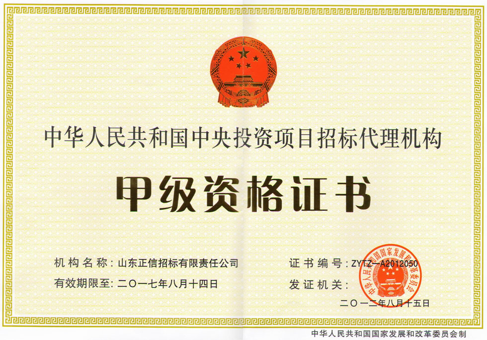 中央投資項(xiàng)目招標(biāo)代理機(jī)構(gòu)甲級資格證書